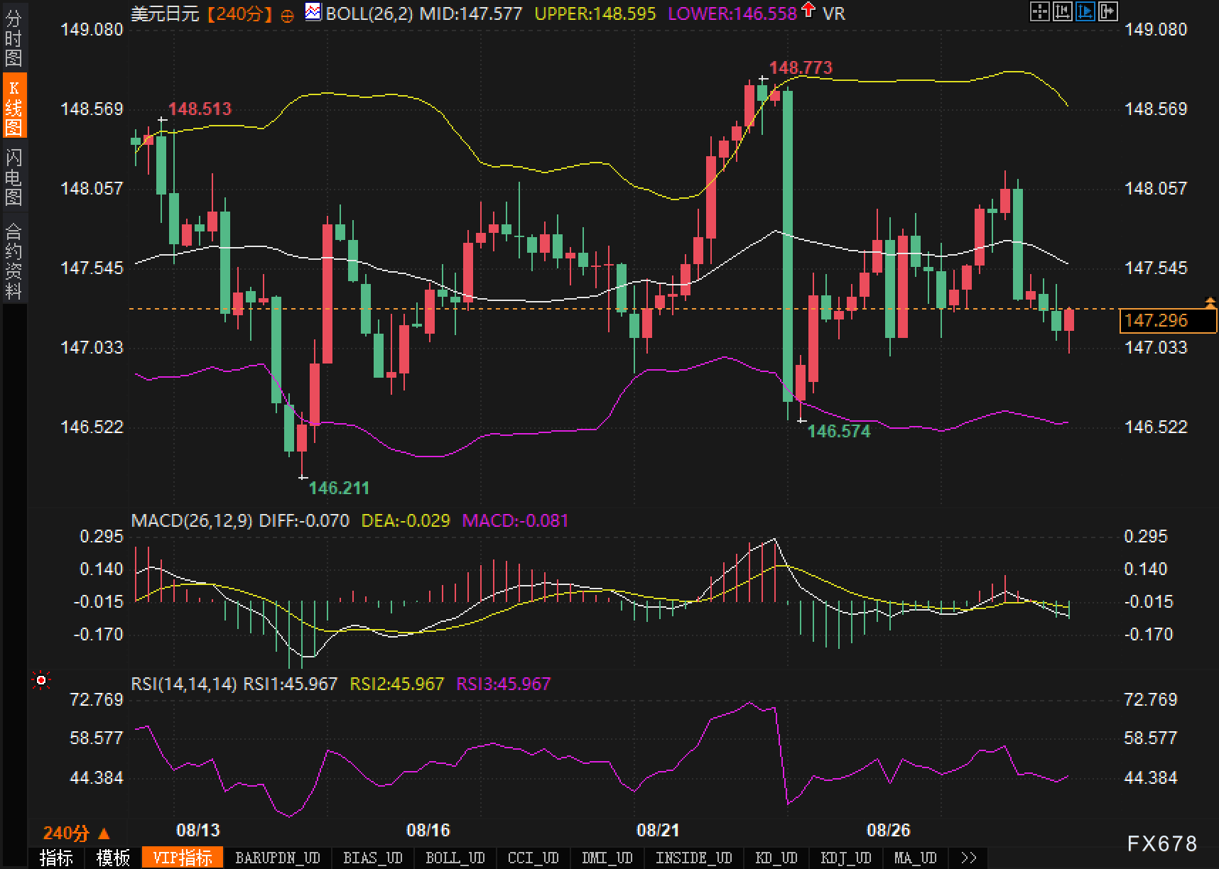 240分钟周期下,布林中轨147.577,上轨148.595,下轨146.558;最新价147.296,处于中轨下方、带宽适中。结构上,汇价曾拉至148.773的阶段高点,随后回撤,一度下探146.574,更早前最低回撤146.211,与下轨形成“共振支撑”。其后K线围绕147.545的水平参考位密集震荡,阴阳交替、实体偏短,呈标准矩形整理。